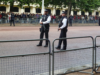 First to patrol the processional route were the police who stood every few yards with their automatic machine guns near the red-coated guards. The difference is that the soldiers, in their bearskin hats, had to remain at attention, or parade rest, while the police were far more casual.