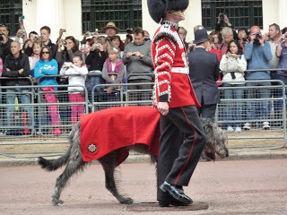Leading the march down the Mall were the Irish Guards, here with their Irish Wolfhound mascot ahead of the troops.