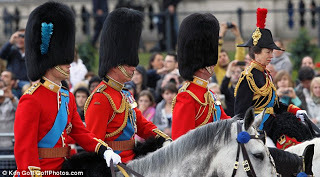 Behind the Queen's Carriage are, l-r, Prince William, Duke of Cambridge, in the uniform of Colonel of the Irish Guards; Prince Charles, Colonel of the Welsh guards; the Duke of Kent, Colonel of the Scots Guards; and Anne, Princess Royal, Colonel of the Household Cavalry's Blues and Royals.