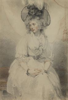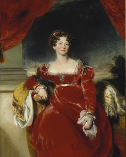 As one of the six daughters of King George III and Queen Charlotte, Princess Sophia's life was constrained by the demands of her parents and court life. She could not see much of her lover, whoever he was. Not a life I would wish on anyone. In this brilliant red dress, at age 48, I can almost feel her flirting with Lawrence as she sat for him. He was quite the ladies' man, having had many flirtations with princesses, actresses, titled married ladies and others, but none of his relationships grew into marriage. On the other hand, he also was very close to some of his male sitters, leading to occasional suspicions in another direction. For more on his love life,see Jo Manning's posts here on January 8, 9, and 10, 2011.