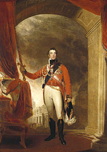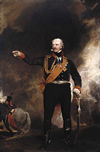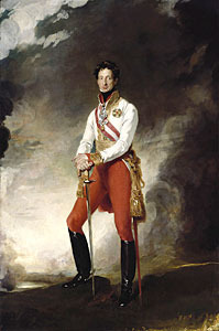 In the upper center of the far wall is this painting of the Duke of Wellington who led the allied troops in the Battle of Waterloo, June 18, 1815. This painting is not in the exhibition, but it has been reproduced so often that it is bound to be familiar. Like the watercolor of the chamber, above, and most of the other heroes below, it belongs to Her Majesty Queen Elizabeth II.