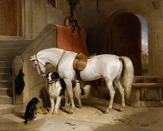 Continuing the horsey theme with a more mellow view, this painting by Edward Landseer (1802-1873) depicts The Favourites, the property of H.R.H. Prince George of Cambridge, as seen in 1834-5. Landseer had a way with animals, didn't he?