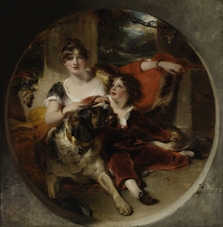 Mrs. Hawkins was a mistress of the imperious 1st Marquess of Abercorn and young John was his son by her. He had several other children by his three wives. Nevertheless, the picture was displayed at the Royal Academy in 1806. One London newspaper found it "deficient in sobriety and simplicity." Another commented that the dog was too big and disliked the view through the circular wall.