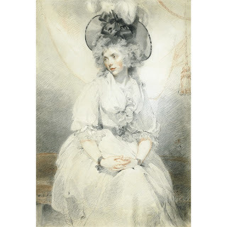 One of his fine portraits, of a friend's wife, Mary Hamilton, is shown in the exhibition, and makes one eager for more of the early pastels. But clients were eager for portraits in oils, and Lawrence excelled here too. He drew Mary Hamilton in pencil, red and black chalk in 1789. The British Museum, which owns the work, writes, "This important drawing of Mary Hamilton is arguably the most beautiful female portrait of its type remaining in this country." A detail of the drawing was used as the cover for a 2008 exhibition at the British Museum The Intimate Portrait, below.