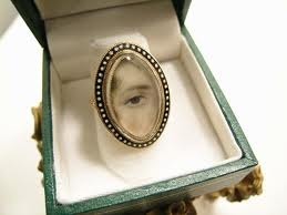 Ather problem – which perhaps accounts for the rarity of eye miniatures set into rings rather than brooches, pendants, or cases – is that water could get under the glass protecting the miniature and wash away the watercolors. Washing hands was death to a lover's eye set into a ring.