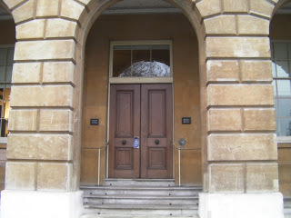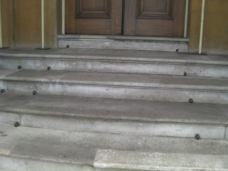 The steps leading up to the front door. Note the black dots going up each side of the steps. A carpet rail would be slid into these iron rings to hold a stair carpet in place during important events. Personally, I think our visit is an important event in itself, but I suppose since we're on first name terms with Artie our visit is considered informal.