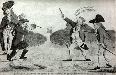 A barbarous and fiercely-contested duel was fought in November 1778, between two foreign adventurers, at Bath, named Count Rice and the Vicomte du Barri. Some dispute arose relative to a gambling transaction, in the course of which Du Barri contradicted an assertion of the other, by saying, "That is not true!" Count Rice immediately asked him if he knew the very disagreeable meaning of the words he had employed. Du Barri said he was perfectly well aware of their meaning, and that Rice might interpret them just as he pleased. A challenge was immediately given and accepted. Seconds were sent for, who, arriving with but little delay, the whole party, though it was not long after midnight, proceeded to a place called Claverton Down, where they remained with a surgeon until daylight. They then prepared for the encounter, each being armed with two pistols and a sword.