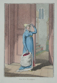 In the above print, titled "Committee of Inquiry" (available for £180 @Grosvenor Prints in Hampton, Middlesex), the descriptive text from Grosvenor Prints has Mrs. Clarke "standing in the lobby of the House of Commons, a section of which is seen through the partly open door: the corner of three tiers of empty benches and the gallery, with a strip of the Speaker's chair, showing his right elbow." Mrs. Clarke wears a blue pelisse over a simple white dress; on her head rests a straw bonnet with a lace veil. With her left hand she raises the hat's veil from her face. The very, very large object on her right hand is a fur muff. Again, as per the description, "She is elegant, alluring, and assured."