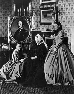 In addition, I regularly found mourning photographs, or postcards, featuring royal figures. The advent of photographs, and especially daguerreotypes in 1839, made portraiture available to everyone and it was soon adapted for mourning purposes, with Queen Victoria embracing the medium wholeheartedly. Due to published images of Queen Victoria and her family in mourning for Prince Albert like those below, it soon became the vogue to have photos made of oneself in mourning.