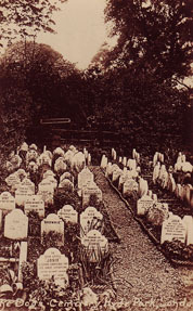 I chose to use this photo of parents sitting on either side of their deceased daughter as representative of the posing of the dead since it's the least offensive. There are photographs of children and adults propped up in attitudes of play and in prayer. There's a particularly macabre photo of a dead fireman who has been propped up on a stand like a mannequin, dressed in uniform and wearing his hat. All of these photos have one thing in common - it is evident in each that the subject is deceased. The "lifelike" poses aren't fooling anyone. In some cases, the dead, white, unseeing eyes of the subject aim straight at the camera. And lest you think that mourning photography was confined to humans, here is a Victorian photograph of the pet cemetary in London's Hyde Park.