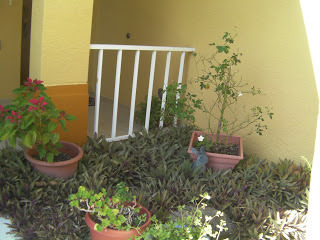 You can barely see him (her), but he's standing in the flower pot to the right, behind the white railings.
