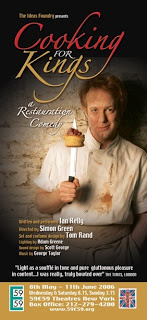 A review by New York Theater Wire said: 'Kelly's performance is as tart as a lemon, as sweet as chocolate, as savory as a thick stew. And finally, it is as satisfying as a banquet. From early childhood most people learn to equate food with love. But few take the metaphor to the same extremes as legendary French chef Antonin Careme, whose life story is told in Ian Kelly's one-man-show "Cooking for Kings." Kelly fills his play with tantalizing details and garnishes them with ironic wit and clever wordplay. As a performer, Kelly has boundless energy and tremendous powers of concentration and he makes a technically difficult play look deceptively easy. While Careme, who is actually cooking, grabs bowls, pots and utensils from an overhead rack and chops, stirs and heats, he describes his activities with the zest of Julia Child. And Careme is accomplished at multitasking. He is never at a loss for words. He never loses his train of thought. If Careme's story is fascinating because of the famous people he knew, the tumultuous times he lived in and the many innovations he made in the art of cooking (from the dishes he made to the hat he wore), it is powerful on a more personal level. Kelly portrays the great chef as vain and sarcastic but also vulnerable and ultimately tragic.'
