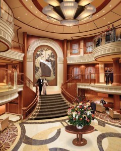Cunard ships, while among the most modern afloat, are known for their traditional luxury, accentuated by extensive use of brass, classic fabrics, marble and highly polished woods. One challenge for Queen Elizabeth's designers was how to treat the significant central space on the sweeping staircase in the ship's soaring Grand Lobby.