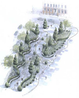 The garden reflects Britain in its design; with City of London style bollards, paving quarried in Scotland and Wales and benches produced in England which were completed in Northern Ireland. The Garden was designed by Isabel and Julian Bannerman, leading British landscape architects best known for their work for HRH The Prince of Wales and British sculptor Simon Verity undertook the stone carving of the county map of Great Britain.