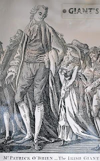 Patrick Cotter O'Brien (1760-1806) was at one time the tallest man in the world, reported to stand anywhere from 8' 1" to 8' 6" tall. Patrick Cotter was born at Kinsale, County Cork in either the year 1760 or 1761. When he was a teenager, a travelling showman discovered him working as a bricklayer and brought him to England to star in his 'freak of nature' show. He added the stage name 'O'Brien' to his own to connect himself with the legendary Celtic giants. The showman who'd discovered Patrick and paid him fiftypounds per annum also obtained the right to exhibit him for three years in England. Details become sketchy, but it appears as if the showman then attempted to sublet the right to show Patrick to another and Patrick objected. The showman then charged Patrick with a fictitous debt and he was thrown into a sponging house in Bristol. Soon after, a visitor to the Sheriff, a man of means, met Patrick, heard his tale and succeeded in having him freed from jail and, more importantly, from any obligation he might have had to the showman - shades of Dickens!
