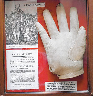 The remainder of Patrick's life was spent in Bristol and he is there still referred to as the 'Bristol Giant'. When he died in 1806, he instructed that his body be protected from bodysnatchers and the knives of curious surgeons. His coffin, therefore, born by 14 pallbearers, was lowered into a vault cut 12 feet deep into solid rock and heavy iron bars were cemented into the walls. Patrick left his clothing to a servant, who dressed up a huge figure in resemblance of his master in the clothes and exhibited them throughout London. His considerable earnings Patrick left to his mother. His giant boots are on diplay at the Bristol Museum and, this past summer, one of his super-sized gloves was at the centre of an eccentric exhibition at the Head of Steam museum in Darlington.