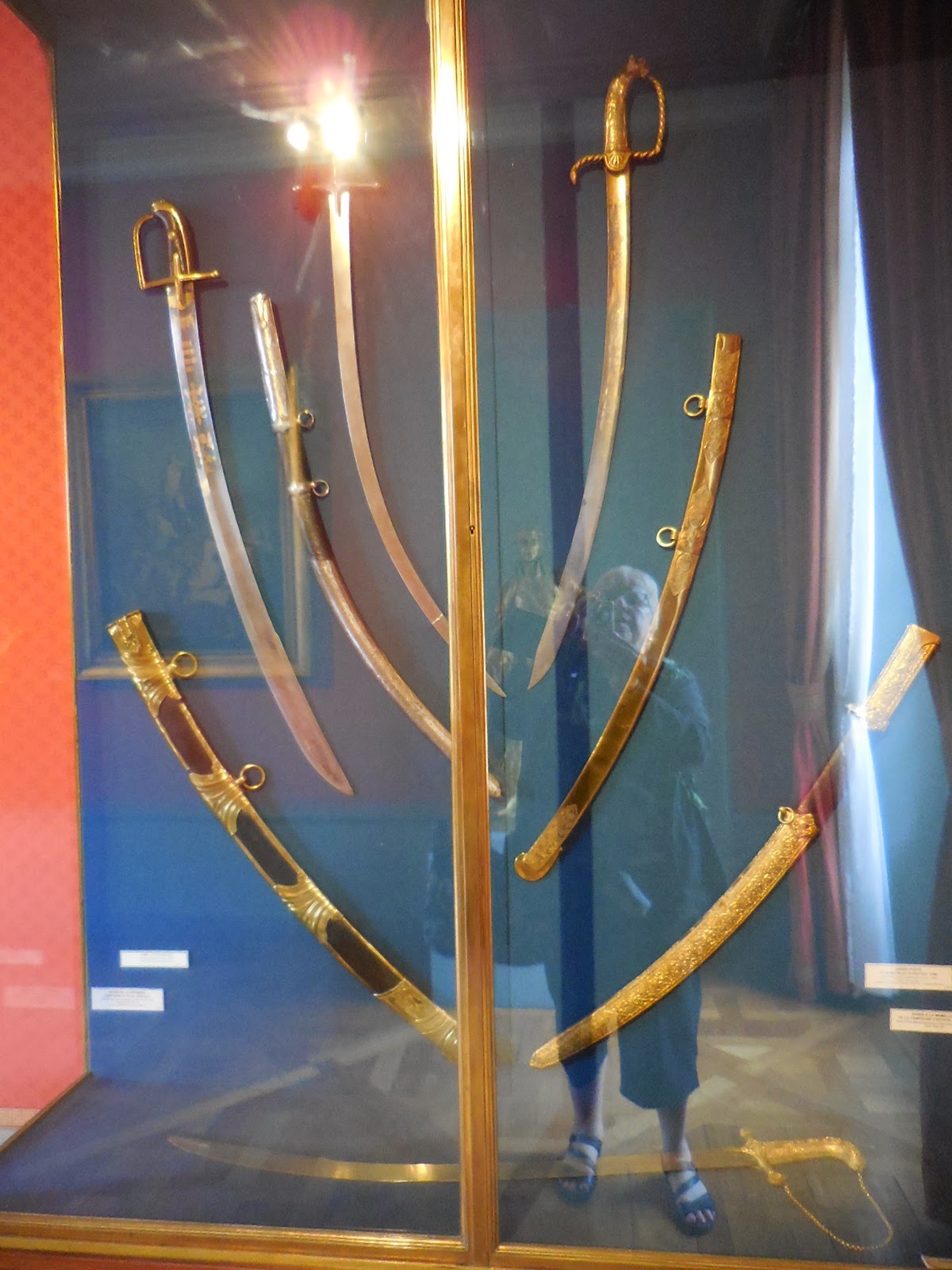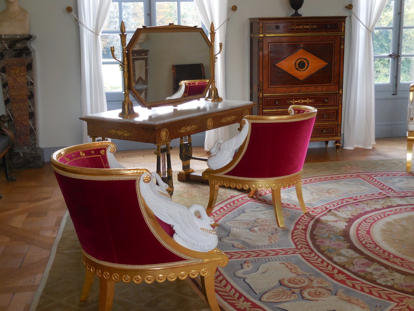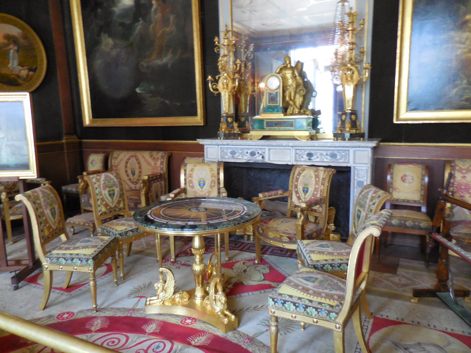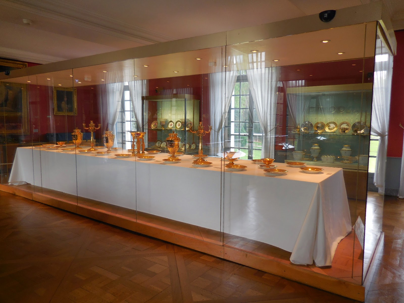 Josephine's gold table serviceThe suite of rooms belonging to Josephine begins with a sitting room filled with red velvet and gilt chairs with white swan armrests, unique in my experience, Not even the Prince Regent had these! I can only assume that he never heard of them.