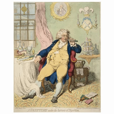 In his excellent book, Ian Kelly reproduces the menu of 18 January, 1817, for a dinner for Grand Duke Nicholas of Russia: eight soups, eight releves de Poisson, fifteen Assiettes Volantes, eight grosses pieces, forty entrees, eight pieces montees, eight roasts and thirty-two entremets." Kelly writes, "the banquet was to be seen and experienced as part of the theater of international relations -- Napoleon's chef creating a gastronomic spectacle for the conquering British monarch and his Russian allies." Excess indeed.