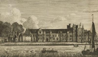 The English palace, Greenwich (above), was originally built in 1433 by Humphrey, Duke of Gloucester, a brother of Henry V. It was a convenient spot for a castle, 5 miles from London and Thames-side, and was popular with subsequent rulers, especially Henry VIII. His father, Henry VII, remodeled the place extensively between 1498-1504 (after dispatching the previous occupant, Dowager Queen Elizabeth, to a convent). The new design was after the trendy “Burgundian” model, with the facade refaced in red Burgundian brick. Though the royal apartments were still in the “donjon” style (i.e. stacked rooms atop rooms), there were no moats or fortifications. It was built around 3 courtyards, with the royal apartments overlooking the river and many fabulous gardens and mazes, fountains and lawns.At the east side of the palace lay the chapel; to the west the privy kitchen. Next door was the church of he Observant Friars of St. Francis, built in 1482 and connected to the palace by a gallery. This was the favorite church of Katherine of Aragon, who wanted one day to be buried there (of course, that didn’t turn out quite as she planned…)Though there are paintings and drawings of the exterior, not much is known of the interior decorations. The Great Hall was said to have roof timbers painted with yellow ochre, and the floors were wood, usually oak (some painted to look like marble). The ceilings were flat, with moulded fretwork and lavish gilding, embellished with badges and heraldic devices (often Katherine’s pomegranates and Henry’s roses). The furniture was probably typical of the era, carved dark wood chairs (often an X-frame design) and tables, benches and trunks. Wool or velvet rugs were on the floors of the royal apartments only, but they could also be found on tables, cupboards, and walls. Elaborate tiered buffets showed off gold and silver plate, and treasures like an gold salt cellar engraved with the initials “K and H” and enameled with red roses.It was a royal residence through the reign of Charles I (1625-49), but under the Commonwealth the state apartments were made into stables, and the palace decayed. In 1662, Charles II demolished most of the remains and built a new palace on the site (this later became the Royal Naval College), and landscaped Greenwich Park. The Tudor Great Hall survived until 1866, and the chapel (used for storage) until the late 19th century. Apart from the undercroft (built by James I in 1606) and one of Henry VIII’s reservoir buildings of 1515, nothing of the original survives.