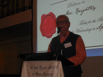 After luncheon, Susan Forgue and Victoria Hinshaw presented London High Society in Austen's Novels, including Sue's beautifully made Almack's vouchers.
