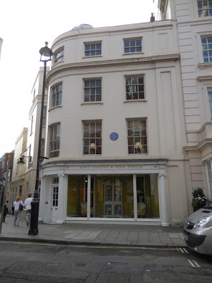This difficult-to-read blue plaque is for Admiral Lord Nelson, who lived here at 103 New Bond street. It concludes, "Fell at Trafalgar, 1895."