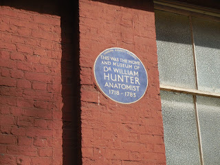 Plaque on #14 Great Windmill Street marking the anatomy theatre and first location of the museum of Anatomist Dr. William Hunter (1718-1783); his collection is now at the University of Glasgow; his brother John, also a physician, founded the collection known as the Hunterian Museum at the Royal College of Surgeons of England in Lincoln's Inn Fields.