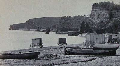 (You can see the arch at the far left in this 1881 photo. At low tide it was, and still is, approachable on foot – or horseback. What you can’t see is the railroad, built directly along the beachfront in the 1840s. In laying the railbed, they also cut through the headland. The arch, and the rock that contains it, still exist, however. And I sure would have liked to see them before I wrote about them!)