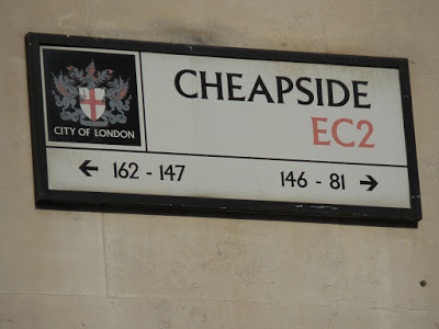 Victoria here, relating our activities after the Duke of Wellington Tour back in September 2014. After wandering Hampstead, Kristine and I needed a good sit-down -- and where better than on a London bus...so we grabbed one and had a ringside seat for the street scenes from Hampstead all the way to the City of London. It is always fun to explore a new area -- and we were looking for Cheapside, once a popular shopping area.