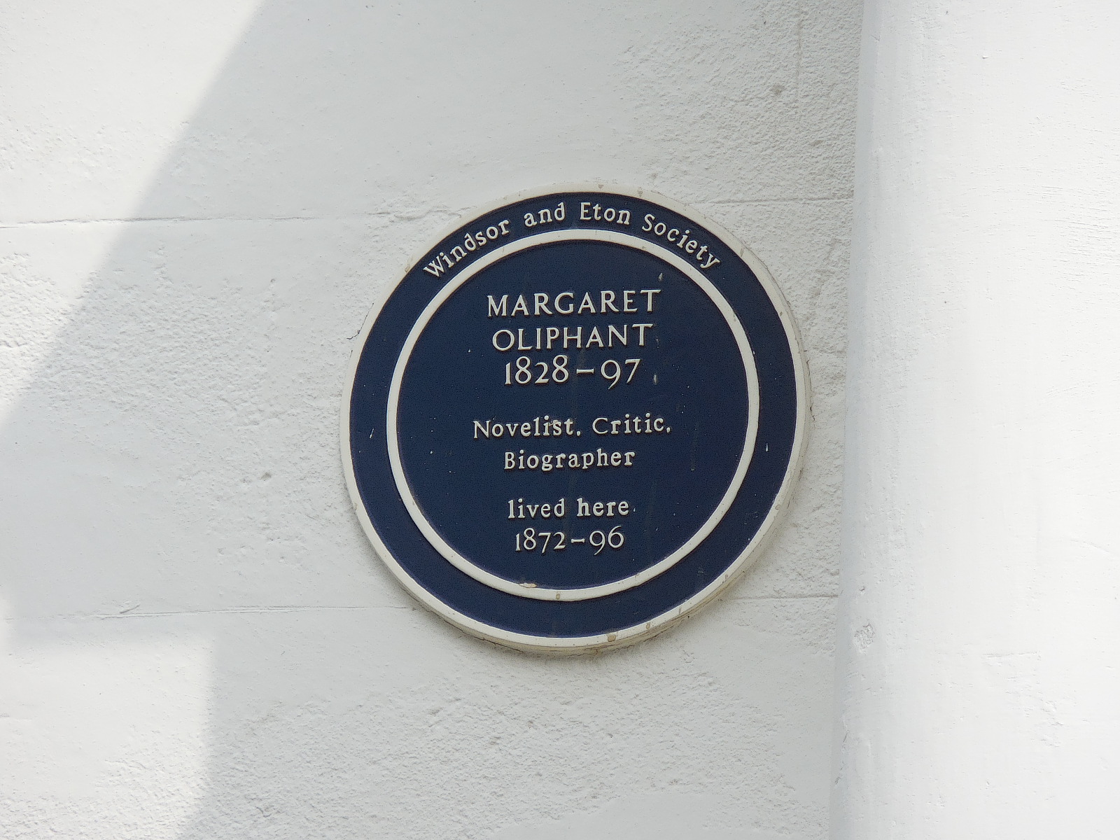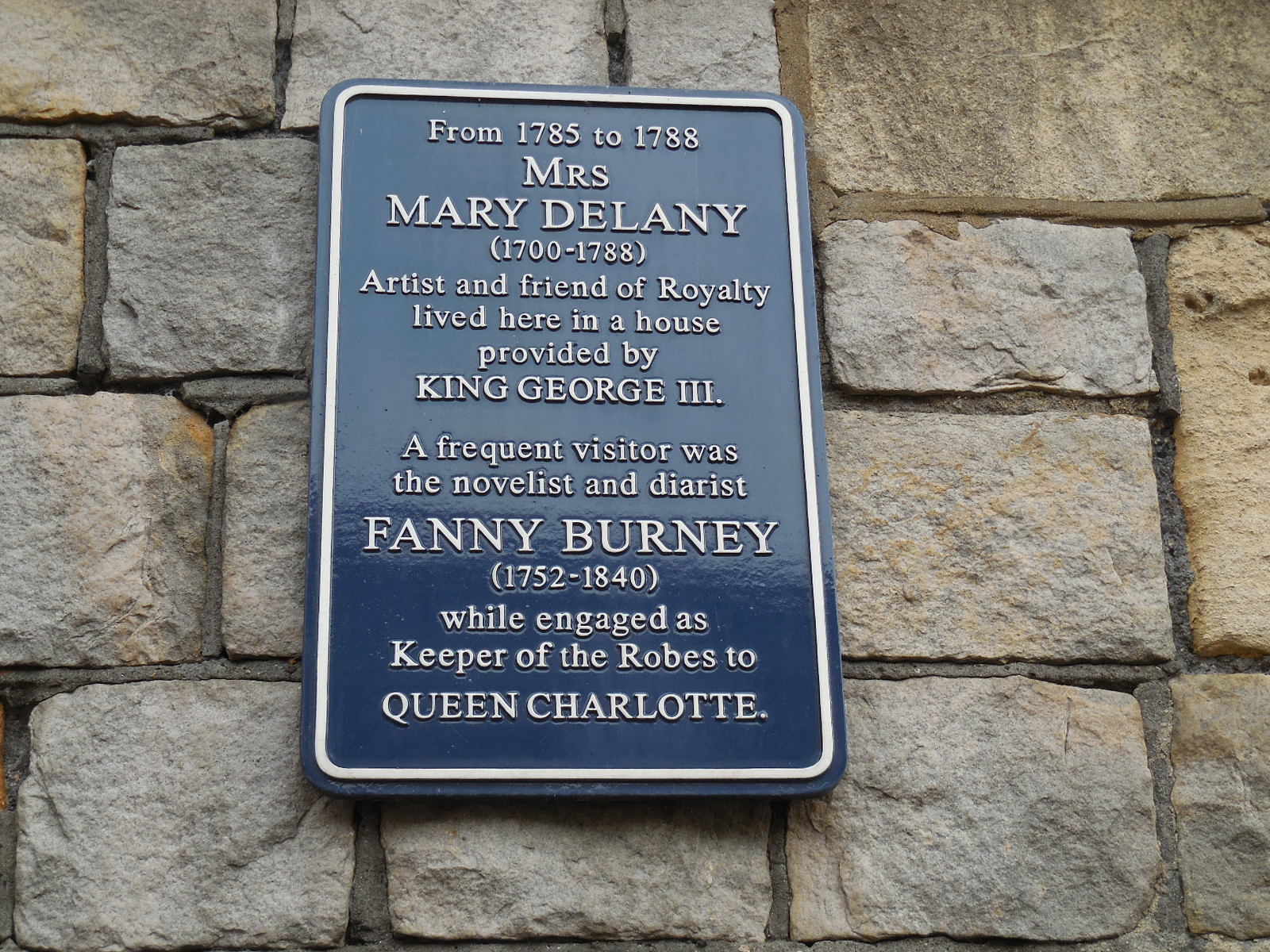 On a wall near the castle, a sign commemorates Mrs. Delaney, an artist, and Fanny Burney, noted novelist and playwright.
