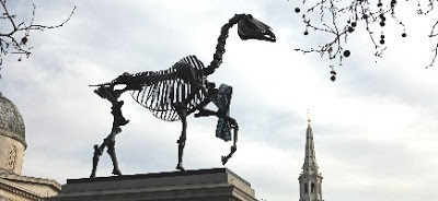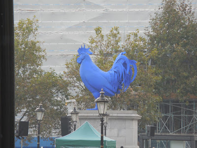 The blue rooster was the Fourth Plinth sculpture in 2014. Officially it was Hahn/Cock by Katharina Fritsch. It was replaced for the next 18-month stint on the Fourth Plinth by the politicially provocative Gift Horse by German-American artist Hans Haacke.