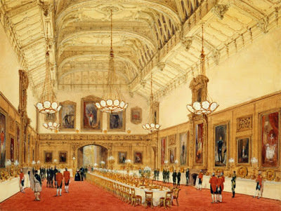 To commemorate the victory of the British, Austrian, Prussian, Russian forces and their allies over Napoleon, George IV envisioned a splendid banquet hall. The large hall replaced several rooms in the castle and includes many limewood carvings by Grinling Gibbons and his assistants in the 1680's,salvaged from a former chapel. Most of the paintings were executed by Sir Thomas Lawrence, (1769-1830) as commissioned for the Room in Windsor Castle designed by Sir Jeffry Wyatville and completed in the reign of William IV. Unless otherwise indicated, all paintings done by Lawrence or his studio.