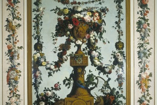 Queen Charlotte (1744-1818) invited prominent artist Mary Moser, RA (1744-1819), to decorate the room with her floral designs. Below, a closer view of a panel.