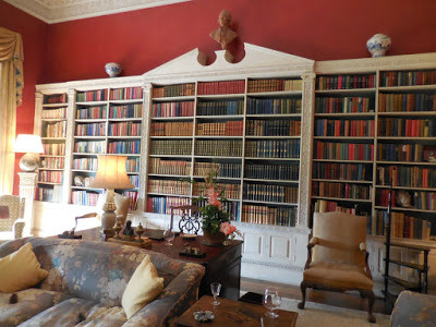 The library opens off the hall, magnificent yet cozy with its scarlet walls and huge book case. Who among us could resist sinking into the sofa with some selections from the shelves?
