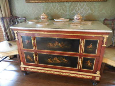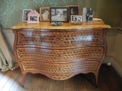 A serpentine marquetry commode with marble top shows photos from the Iliffe days.