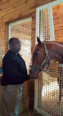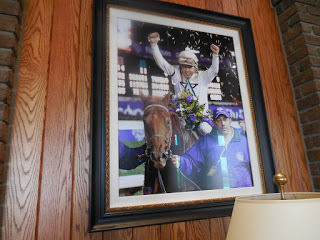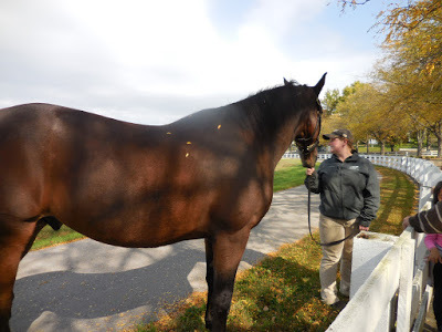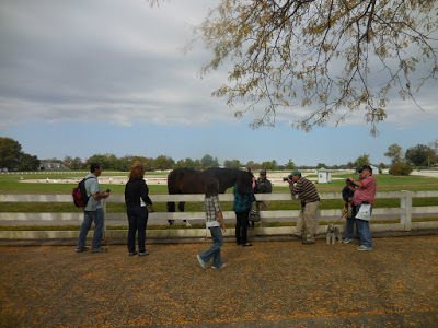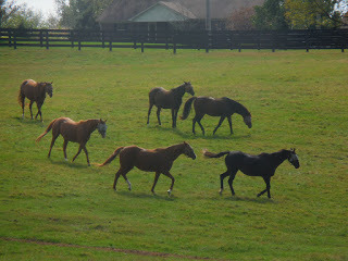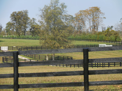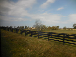 My husband was game for a tour of nearby horse farms, and we took off with about 14 companions and our guide, Shawn -- he was the best! He explained that the Horse Park and most of the Bluegrass farms had changed from white fences to black. Why? Because they have to be painted less frequently and save a lot of money. After all, though lots of starry-eyed girls like me would never consider such a thing, breeding and training horses is a business.