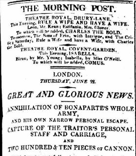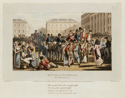 The d’Arblay’s idyll ended when the General was sent off to Luxembourg to recruit soldiers for the royal cause. Frances was left alone to worry and share the concerns of her friends, some bordering on hysteria, as tension steadily increased in the next few weeks. Everyone knew the battle was approaching.“May 13, 1815. My best friend left me to begin his campaign; left me, by melancholy chance, upon his birthday (67th). I could not that day see a human being -- I could but consecrate it to thoughts of him who had just quitted me yet who from me never was, never can be, mentally absent , and to our poor Alexander (their son), thus inevitably, yet severely cast upon himself.”For the month following his departure, she visited with friends, strolled in the park, attended church, and observed everything with her keen eye for detail. She also spent many hours alone, writing and worrying about her son, not doing as well at Cambridge as his parents expected, and particularly about her husband.One of Burney’s most fascinating observations was her view of the Belgian people, for the most part stoic and phlegmatic. As she observed, they had been traded back and forth between warring factions for centuries, spending most of the last decade as part of Napoleon’s Empire. How indeed could they get excited about another change in status? They seemed placidly to accept their fate, to Frances’s incredulity and sometimes consternation. But even in the midst of the unconcerned populace, tensions rose as the streets were crowded with military vehicles horses and soldiers everywhere. She had a near-encounter with the notorious Lady Caroline Lamb*, whose affair with Byron had shocked London. Burney writes, “…I just missed meeting the famous Lady Caroline Lamb … whom I saw crossing the Place Royale,… dressed, Or rather not dressed, so as to excite universal attention, and authorise every boldness of staring, from the general to the lowest soldier, among the military groups then constantly parading the Place, -- for she had one shoulder, half her back, and all her throat and neck, displayed as if at the call of some statuary for modelling a heathen goddess. A slight scarf hung over the other shoulder, and the rest of the attire was of accordant lightness. As her ladyship had not then written, and was not, therefore, considered as one apart, from being known as an eccentric authoress, this conduct and demeanour excited something beyond surprise, and in an English lady provoked censure, if not derision, upon the whole English nation.”Aside from amusement at Burney’s disapproval of the attire, it is interesting to speculate about whether she thought of herself as an “eccentric author” and thus “beyond surprise.”This was a time of considerable unease for her. “During this melancholy period when leisure, till now a delight, became a burthen to me, I could not call my faculties into any species of intellectual service; all was sunk, was annihilated in the overpowering predominance of anxiety for the coming event…”We take up Burney’s account of Brussels again on the day of the Battle of Quatre Bras. “I was again awakened at about five o'clock in the morning Friday, 16th June, by the sound of a bugle in the March aux Bois: I started up and opened the window. But I only perceived some straggling soldiers, hurrying in different directions, and saw lights gleaming from some of the chambers in the neighbourhood: all again was soon still, and my own dwelling in profound silence, and therefore I concluded there had been some disturbance in exchanging sentinels at the various posts, which was already appeased: and I retired once more to my pillow, and remained till my usual hour… (Later) “… my ears were alarmed by the sound of military music, and my eyes equally struck with the sight of a body of troops marching to its measured time. But I soon found that what I had supposed to be an occasionally passing troop, was a complete corps; infantry, cavalry artillery, bag and baggage, with all its officers in full uniform, and that uniform was black.... I learned it was the army of Brunswick. How much deeper yet had been my heartache had I foreknown that nearly all those brave men, thus marching on in gallant though dark array, with their valiant royal chief at their head, the nephew** of my own king, George III., were amongst the first destined victims to this dreadful contest, and that neither the chief, nor the greater part of his warlike associates, would within a few short hours, breathe again the vital air!...“What a day of confusion and alarm did we all spend on the 17th!...That day, and June 18th, I passed in hearing the cannon! Good heaven! what indescribable horror to be so near the field of slaughter! such I call it, for the preparation to the ear by the tremendous sound was soon followed by its fullest effect, in the view of the wounded, the bleeding martyrs to the formidable contention that was soon to terminate the history of the war. And hardly more afflicting was this disabled return from the battle, than the sight of the continually pouring forth ready-armed and vigorous victims that marched past my windows to meet similar destruction.”
