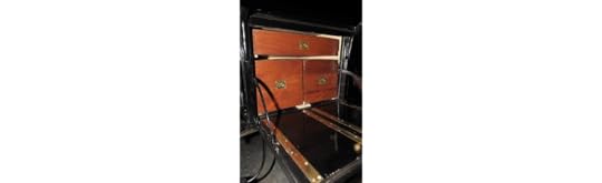 At the back of the Landau there is a leather covered Rumble seat where two footmen would have sat, the seat is mounted on leaf springs to give some comfort during long journeys and is upholstered in a dark blue wool cloth. The area underneath the seat provides additional storage and is accessed via the hinged rear flap.