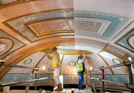 The red carpeting overwhelmed the delicacy of the ceiling and wall decoration. You can also see how the colors of the ceiling were restored to their original hues. When you look at the restored version, you realize the former decor was rather gaudy, too much so for authentic Adam.