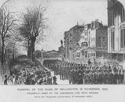 On arriving at the Bricklayers' Arms station, the hearse with the coffin was removed to Chelsea Hospital, under an escort of the 1st Life Guards; and there the remains of the Duke continued to lie in state till removed for the Grand State Funeral which took place on the following Thursday, November 18th.