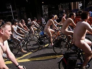 Victoria and I being treated to a view of the annual Naked Bike Ride whilst minding our own business at Apsley House