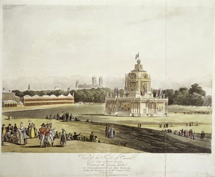 During the summer of 1814, the Prince of Wales, as Prince Regent, planned a series of celebrations in London to mark the victory of the Allies over Napoleon -- a temporary victory it turned out to be, but nonetheless, after so many years of war, everyone was eager to celebrate. Napoleon had surrendered and was sent off to exile in Elba. The Prince Regent invited the heads of the Allied governments to London, but it did not turn out exactly as he wished. The guests often had ideas of their own for entertainment and some of the great fireworks displays turned into conflagrations, though the crowds viewing the extravaganzas did not seem to mind.