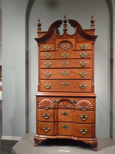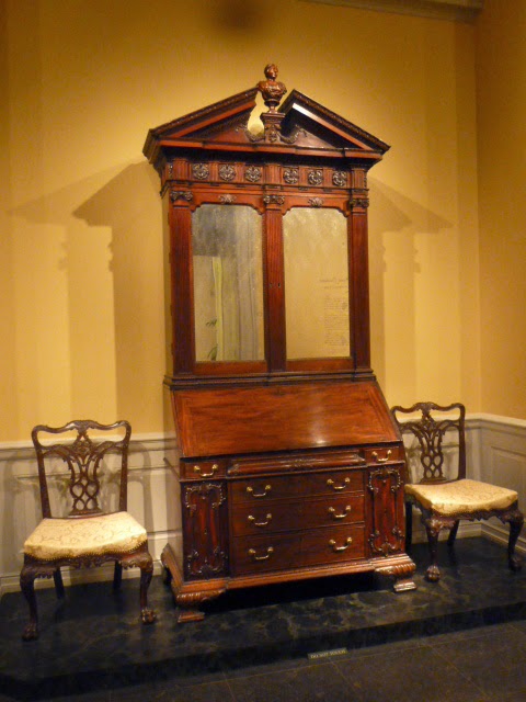 Philadelphia was the leading city of pre-revolutionary America. Colonial furniture makers followed the pattern books of leading English designers such as Thomas Chippendale. Many immigrant craftsmen came to the colonies, and fine imported goods arrived to serve the tastes and growing wealth of leading families. At the top of the desk is a mahogany bust "believed" to be of Catherine Macaulay (1731-1791), a renowned historian and author who "was a great supporter of American liberty." (from the gallery label)