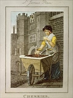 18th Century Print: Cherries; a seller outside the Palace St. James's has often been the venue for Royal levees and receptions . This plate below from the Microcosm of London, 1810, shows a "Drawing Room," where a chosen circle could present themselves and their friends and family formally to the Royals.