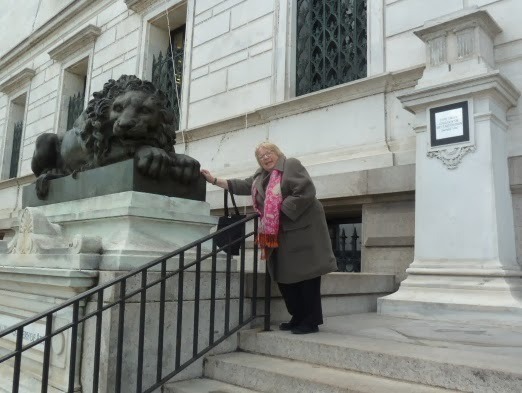Victoria with one of the Lions guarding the entrancePhoto snapped bv Author Diane Gaston I visited for the first time in many years because of the accounts I had read of the negotiations over the gallery's collection, school, and building. Back when I lived in Washington D.C., I went often so this was a sentimental return as well as curiosity about what is going on. Author Diane Gaston and I walked over after a delicious Peruvian lunch at El Chalan with Julie Halperson, who sadly had to return to work after our chat and feast.