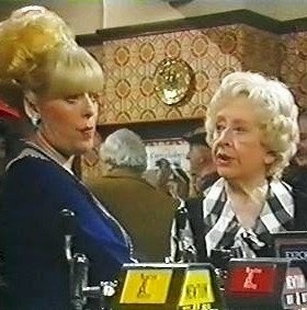 The Rovers was owned by Annie Walker, below right, and staffed by everyone's favorite barmaid and bottle blonde, Bet Lynch, at left.