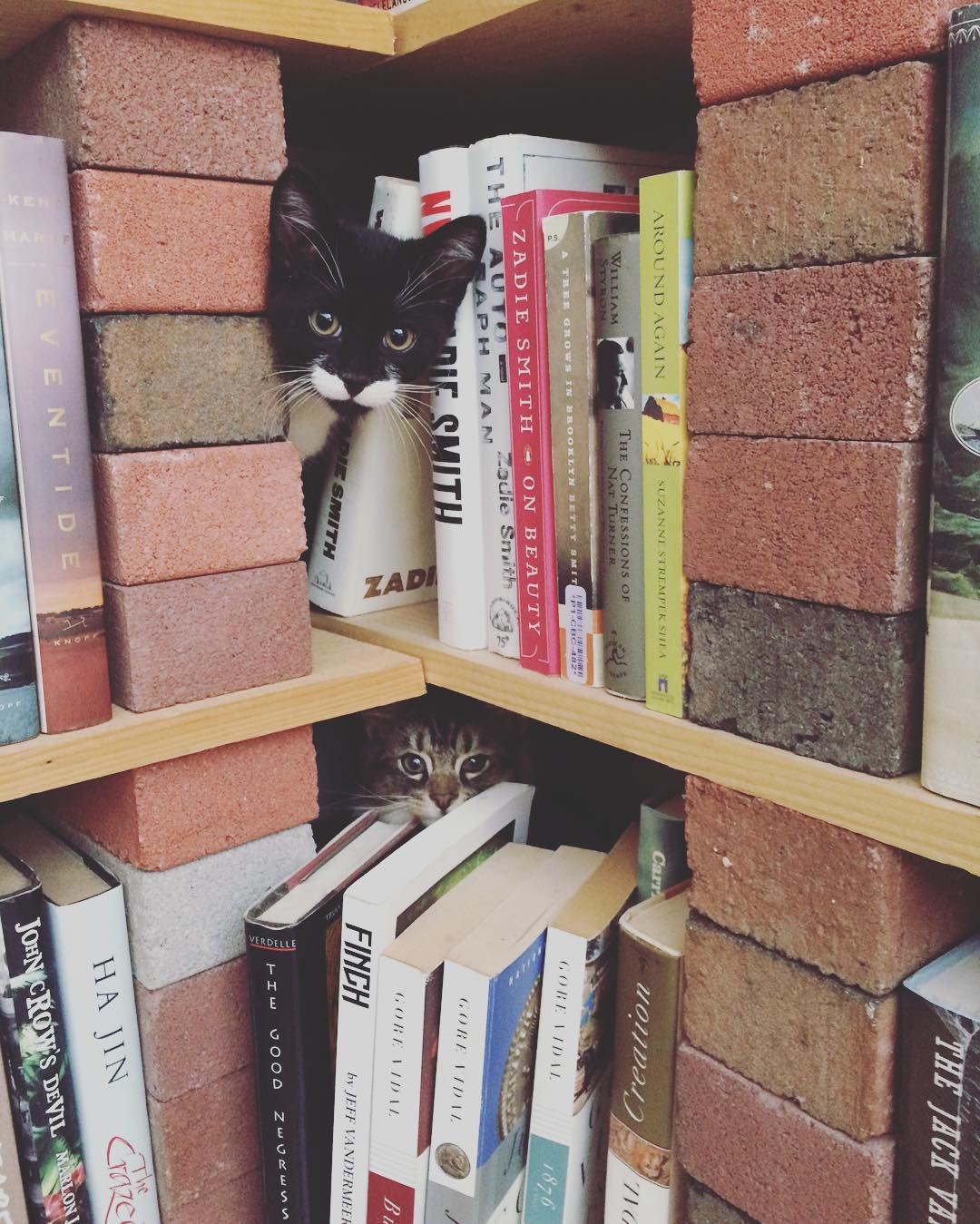 We have two new kittens. They're horrible. As they're supposed to be. And way too cute. They're inclined toward literary things, apparently, as this photo documents. Two kittens. Spot them both!
