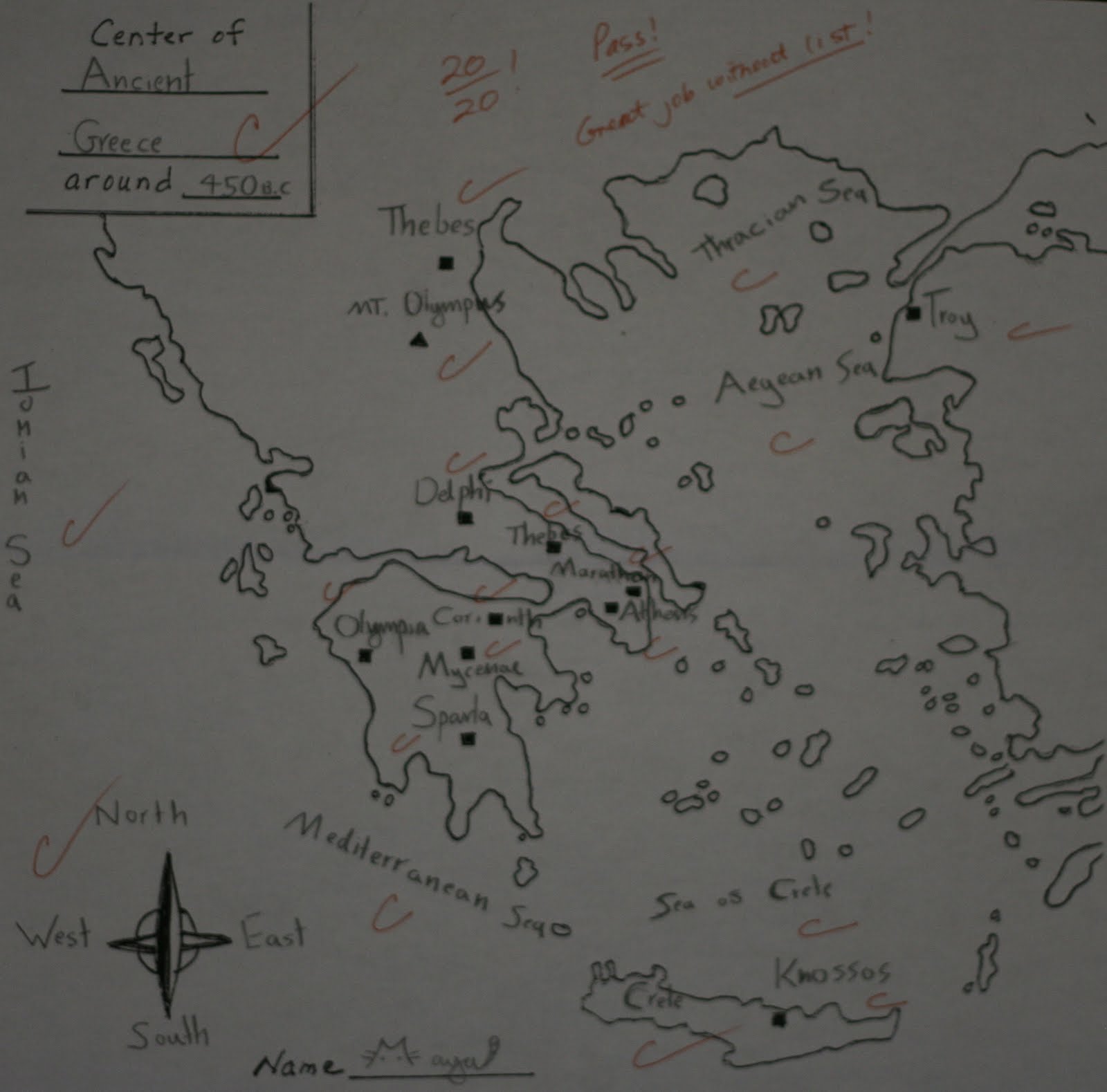 They agreed, and a couple months in things are going wonderfully. The adjustment has been fairly seamless, as we figured it would be. Just so you know, homeschooling doesn't need to mean that the kids are locked in a cabin in the woods getting only their parents' warped interpretation of the world. In fact, we'd always been very social with the way we homeschooled, with lots of outside classes, music and martial arts, nature studies and writing and gymnastics and lots of friends in a large network of other homeschooling families. The kids had always been socialized, so going to school wasn't a shock. It's just different.Including the fact that it includes quizzes! Maya, our sixth grader, had her first quiz a couple weeks ago. It was a combination quiz. One part was about identifying key cities/places on a blank map of Ancient Greece. The second part, should they accept the challenge, was to also make it a spelling test, wherein they located the sites presented to them verbally, so that they had to get the spelling correct as well.
