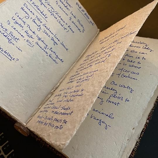 The story changed A LOT in the final years. As a little aside to illustrate how much, the very first incarnation on paper—a quick draft of a scene written perhaps 15 years ago when my kids were about 4 and 6—involved the sisters (who had different names then), Henry, Mister Squirrel, Pipe the bear, and the other animals…at a tea party! (oof!)