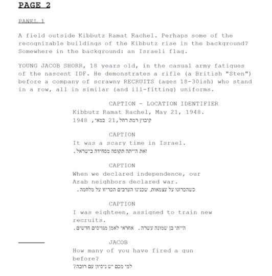 So I recruited the help of my parents, both of whom have translation experience. My mother, in particular, has been teaching University-level Hebrew for decades, and is extremely well-versed in the language. They worked off of my book script, and went caption-by-caption and dialogue-by-dialogue to translate the entire work. Of course, there was no need to translate the panel descriptions - those are merely instructions for the illustrator, and don't appear in the published book.