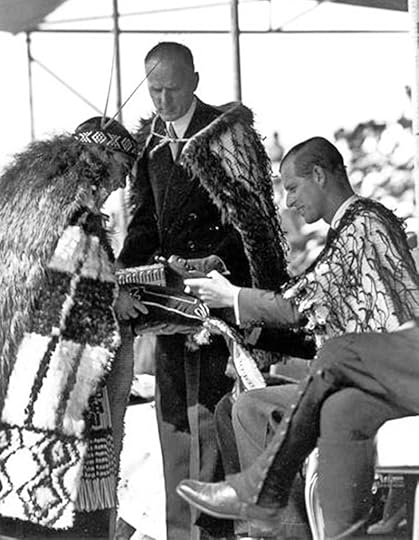 The Duke of Edinburgh receives some carvings at Awara Park during the royal visit to Rotorua on 2 January 1954On 2 January the Queen travelled into Rotorua for a civic reception and official lunch. This was followed by what was described as ‘meeting the Maori people.’ A ceremonial site at Arawa Park had been converted for the occasion into a temporary Marae for this historic occasion which included the traditional powhiri welcome by 140 warriors. Her Majesty received speeches in which she was referred to variously as ‘O stranger from beyond the horizon’ and ‘O Royal daughter of an illustrious line’ for whom there was ‘unswerving devotion.’ After the giving of gifts, one of which was a flaxen Maori cloak, the symbol of a paramount chief (which the Bishop of Aotearoa fastened over the monarch’s shoulders) the Queen made a speech. She indicated she was greatly touched by the kind welcome she had received and expressed the hope that the Maori people would ‘hold fast to your own language and culture…’ She ended with the words ‘Kia ora koutou’ or ‘Good fortune to you all.’ This drew a deafening cheer from those assembled. Her Majesty’s speech was followed by a poi-dance by 300 women from the Arawa tribe, each of whom twirled poi balls of flax with graceful movements of the arms and wrists. Later those gathered joined in the traditional “Ka mate, Ka Mate” haka as the Queen made her departure with the Duke. The royals returned to Moose Lodge for a few days rest, the only engagements being attendance at a church service and a tour of a Maori village at Whakarewarewa.